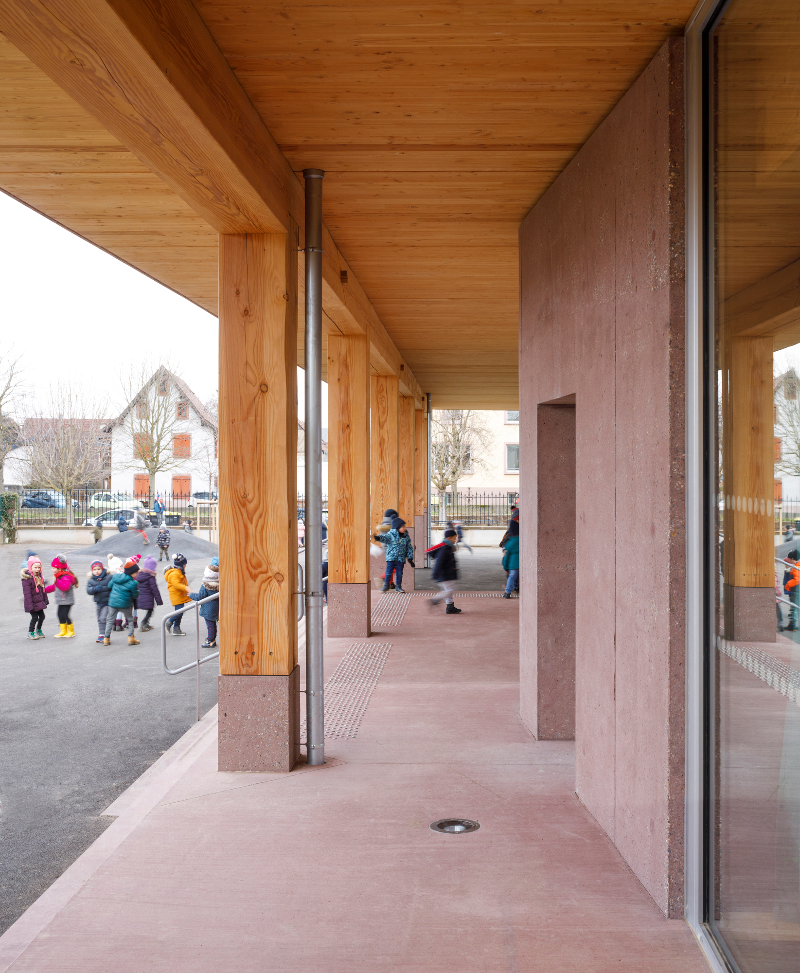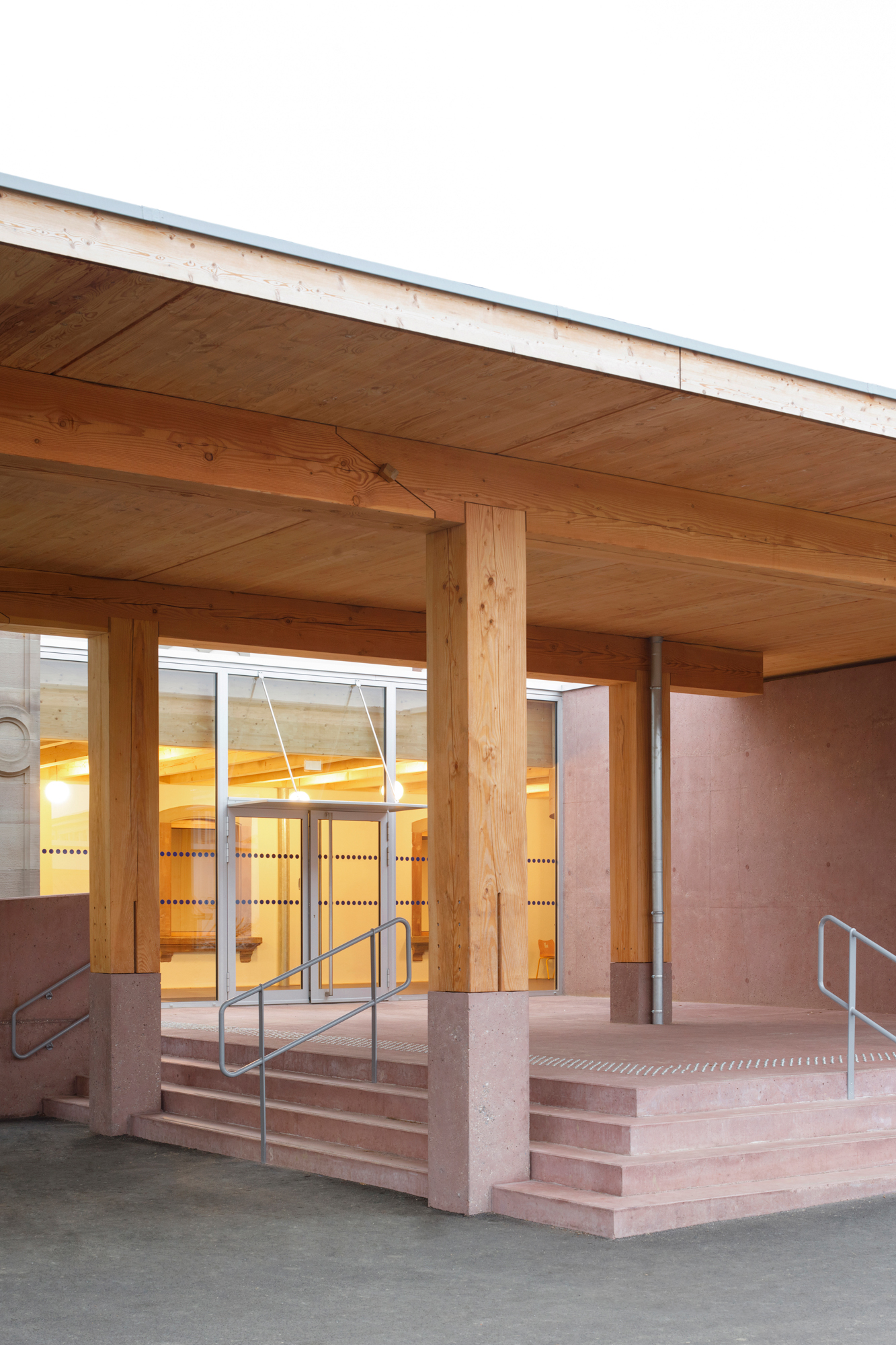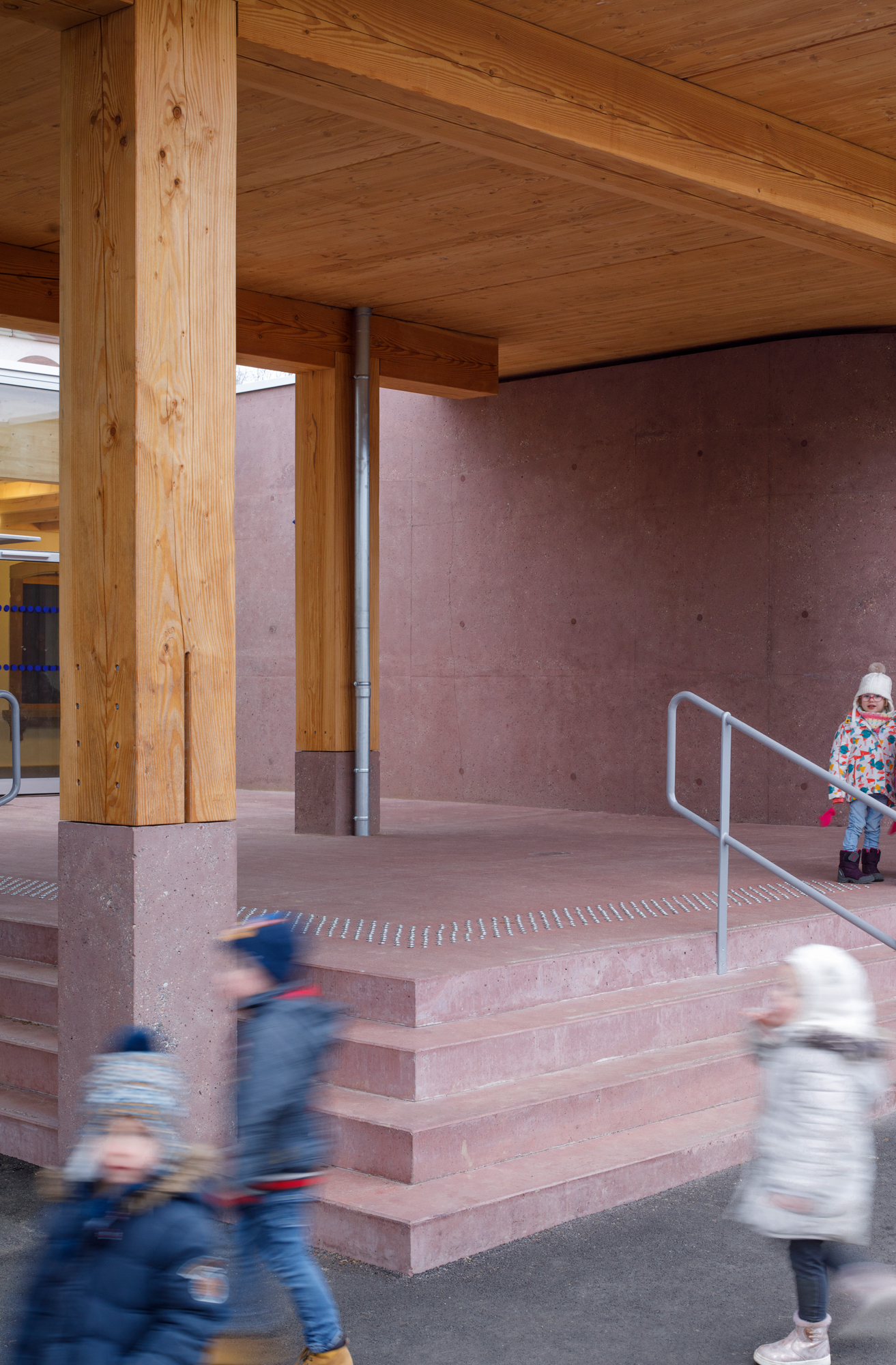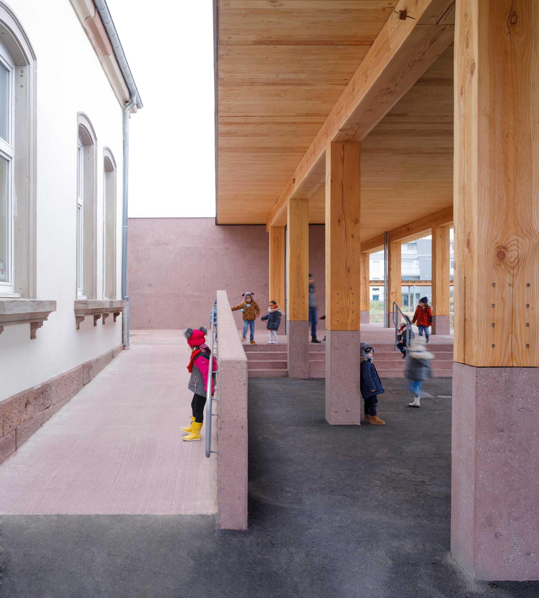 Le préau qui devient parvis devant le hall d’entrée et galerie devant les salles de classes, repose sur des blocs et sur un volume sculptural en béton sablé teinté rose en dialogue avec la pierre de taille du bâtiment existant. Le béton émerge du sol et l’emmarchement épouse la pente naturelle du site. Le hall, à l’articulation entre l’extension et l’existant dont les façades extérieures deviennent intérieures, se prolonge par le large couloir central. Il dessert les quatre salles de classes qui sont séparées entres-elles par un voile en forme de manivelle, rigidifiant le solivage de la toiture et compartimentant différents espaces à l’échelle des enfants.