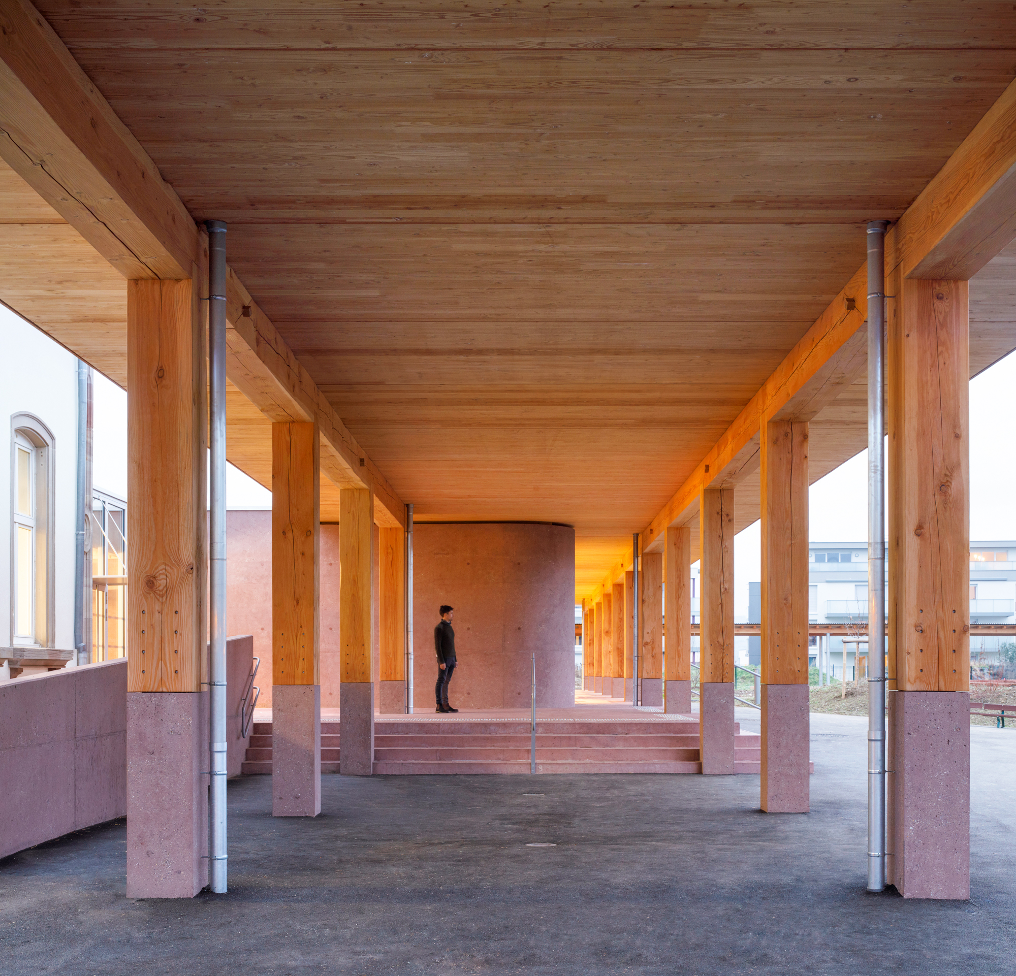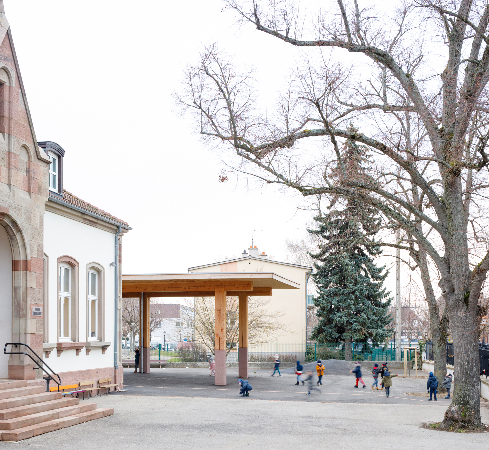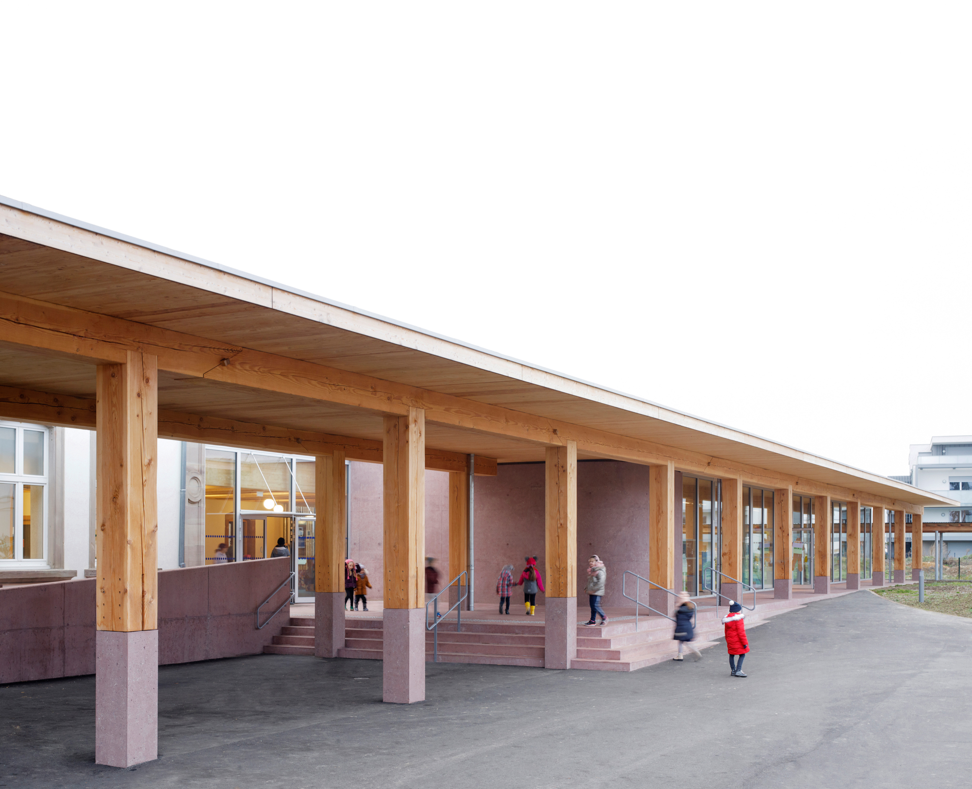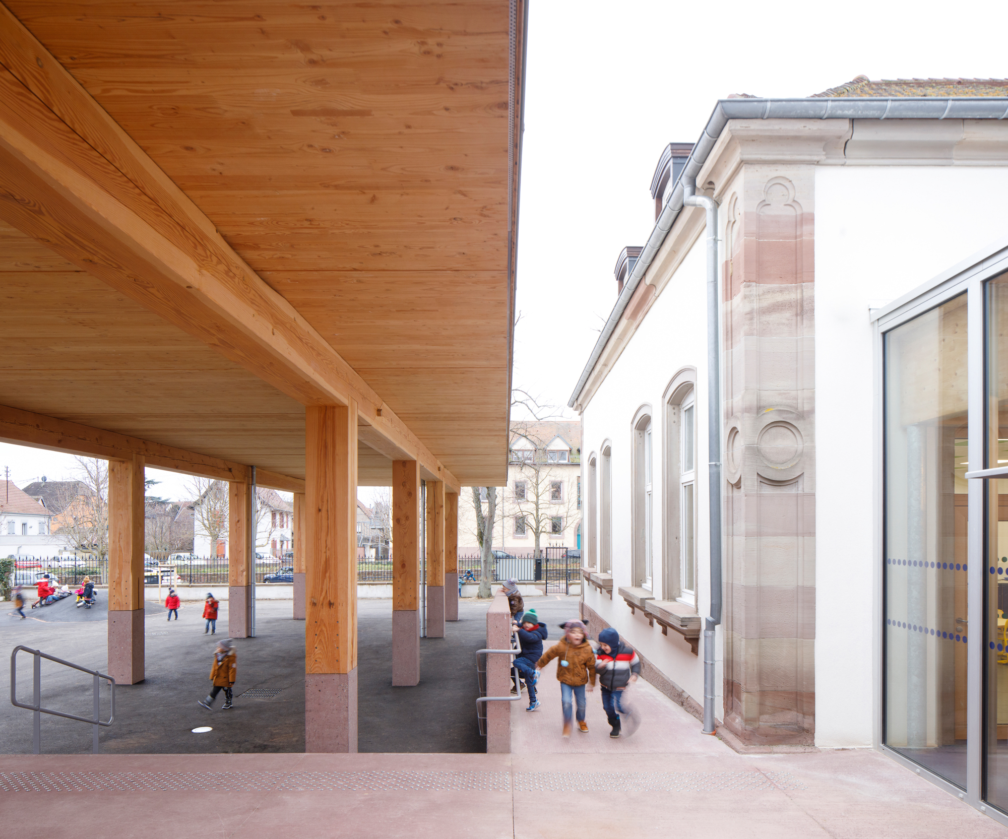 Le préau qui devient parvis devant le hall d’entrée et galerie devant les salles de classes, repose sur des blocs et sur un volume sculptural en béton sablé teinté rose en dialogue avec la pierre de taille du bâtiment existant. Le béton émerge du sol et l’emmarchement épouse la pente naturelle du site. Le hall, à l’articulation entre l’extension et l’existant dont les façades extérieures deviennent intérieures, se prolonge par le large couloir central. Il dessert les quatre salles de classes qui sont séparées entres-elles par un voile en forme de manivelle, rigidifiant le solivage de la toiture et compartimentant différents espaces à l’échelle des enfants.
