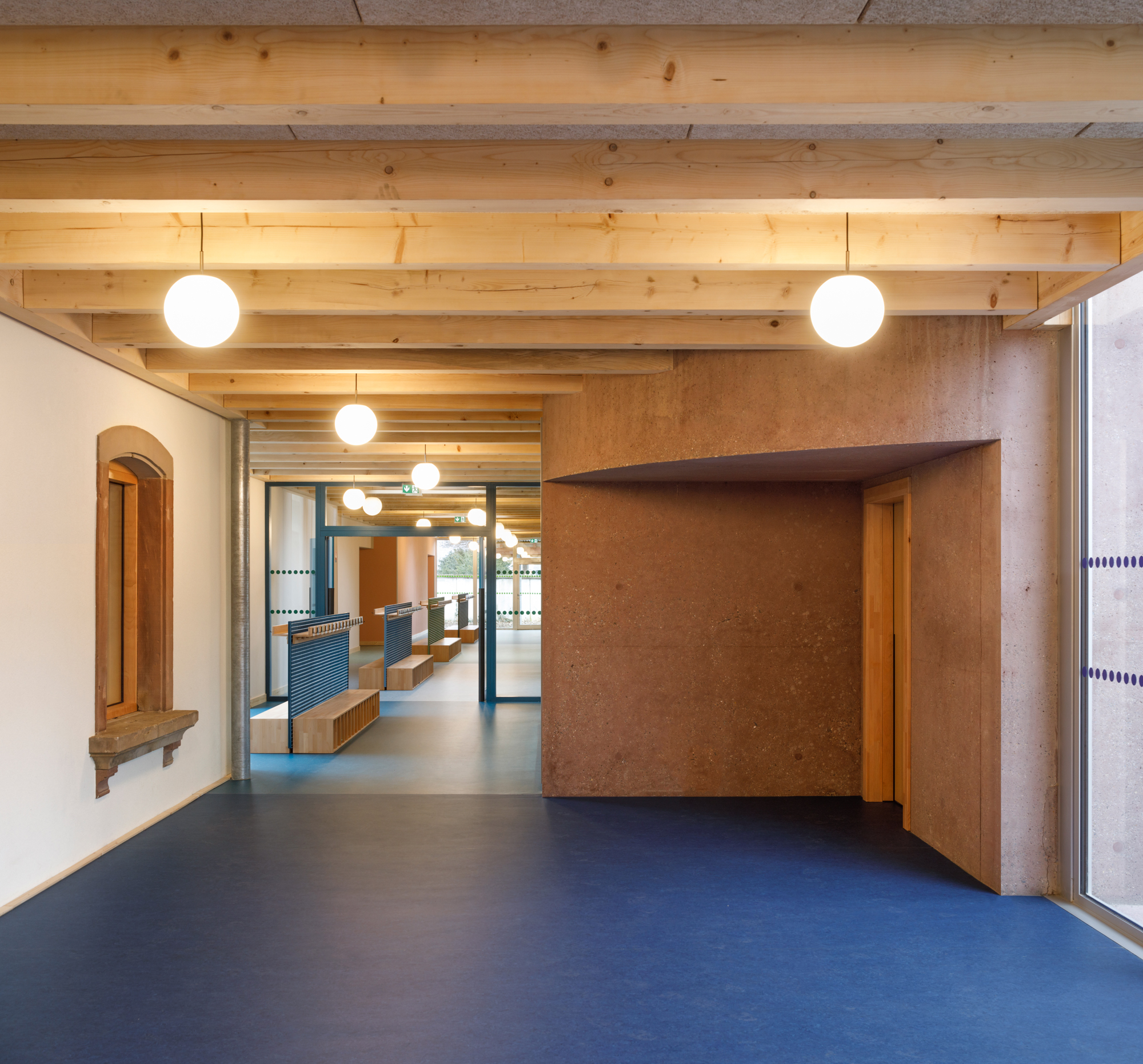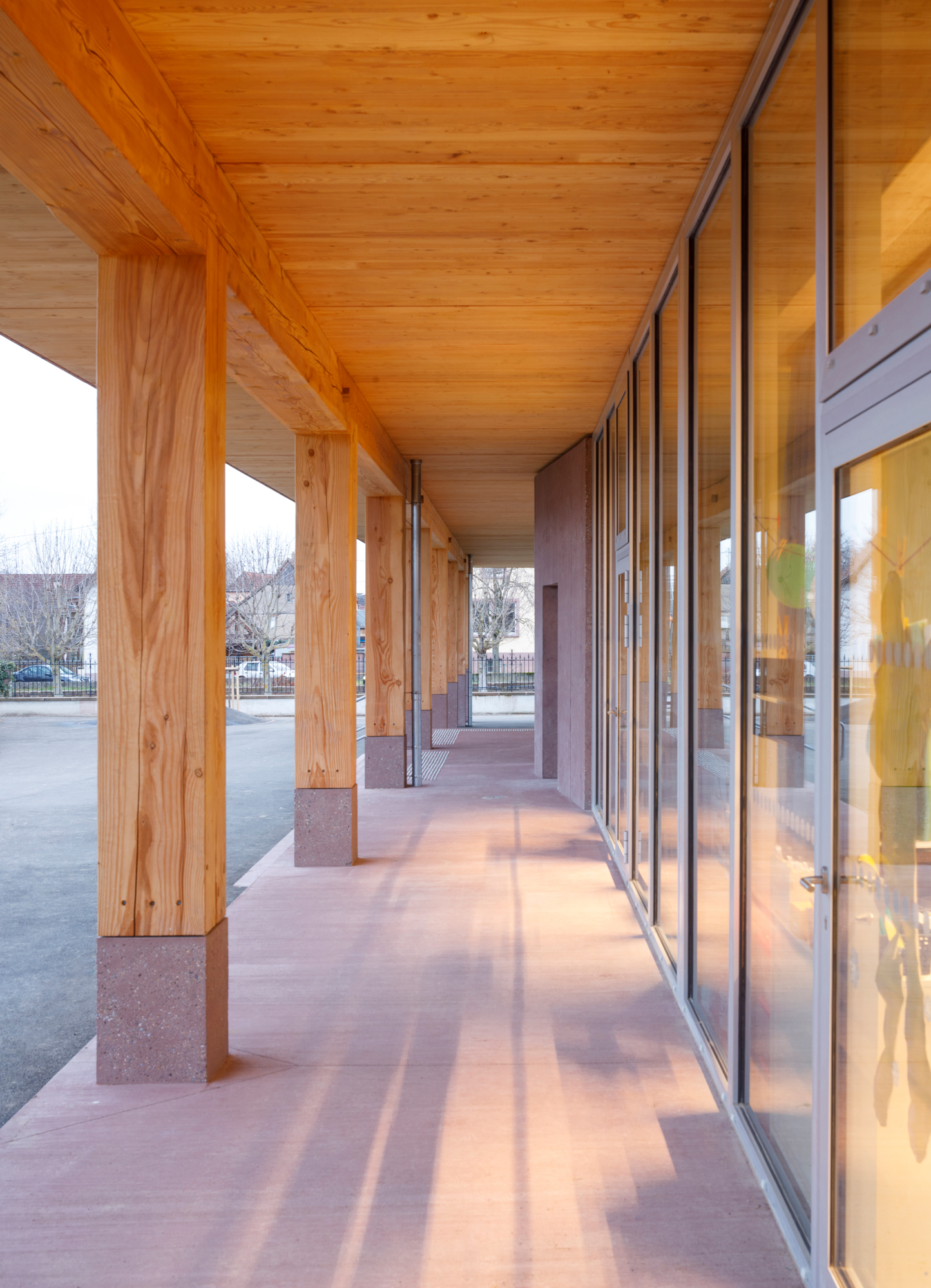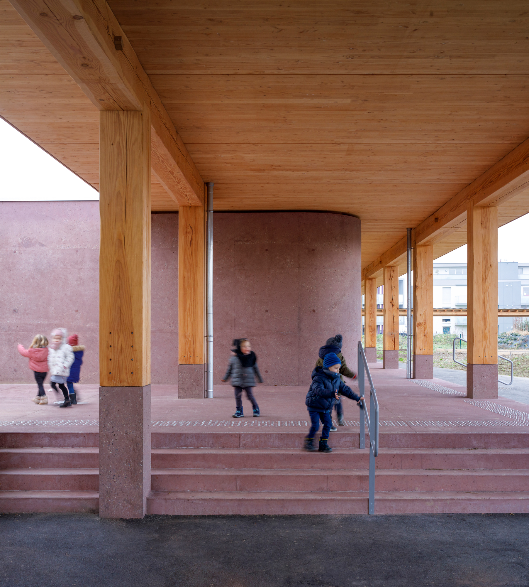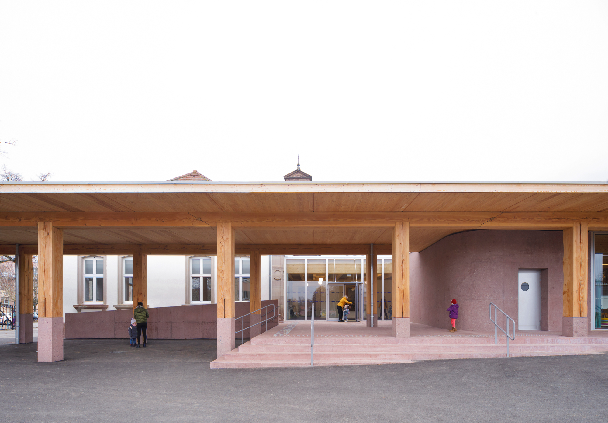 Le préau qui devient parvis devant le hall d’entrée et galerie devant les salles de classes, repose sur des blocs et sur un volume sculptural en béton sablé teinté rose en dialogue avec la pierre de taille du bâtiment existant. Le béton émerge du sol et l’emmarchement épouse la pente naturelle du site. Le hall, à l’articulation entre l’extension et l’existant dont les façades extérieures deviennent intérieures, se prolonge par le large couloir central. Il dessert les quatre salles de classes qui sont séparées entres-elles par un voile en forme de manivelle, rigidifiant le solivage de la toiture et compartimentant différents espaces à l’échelle des enfants.
