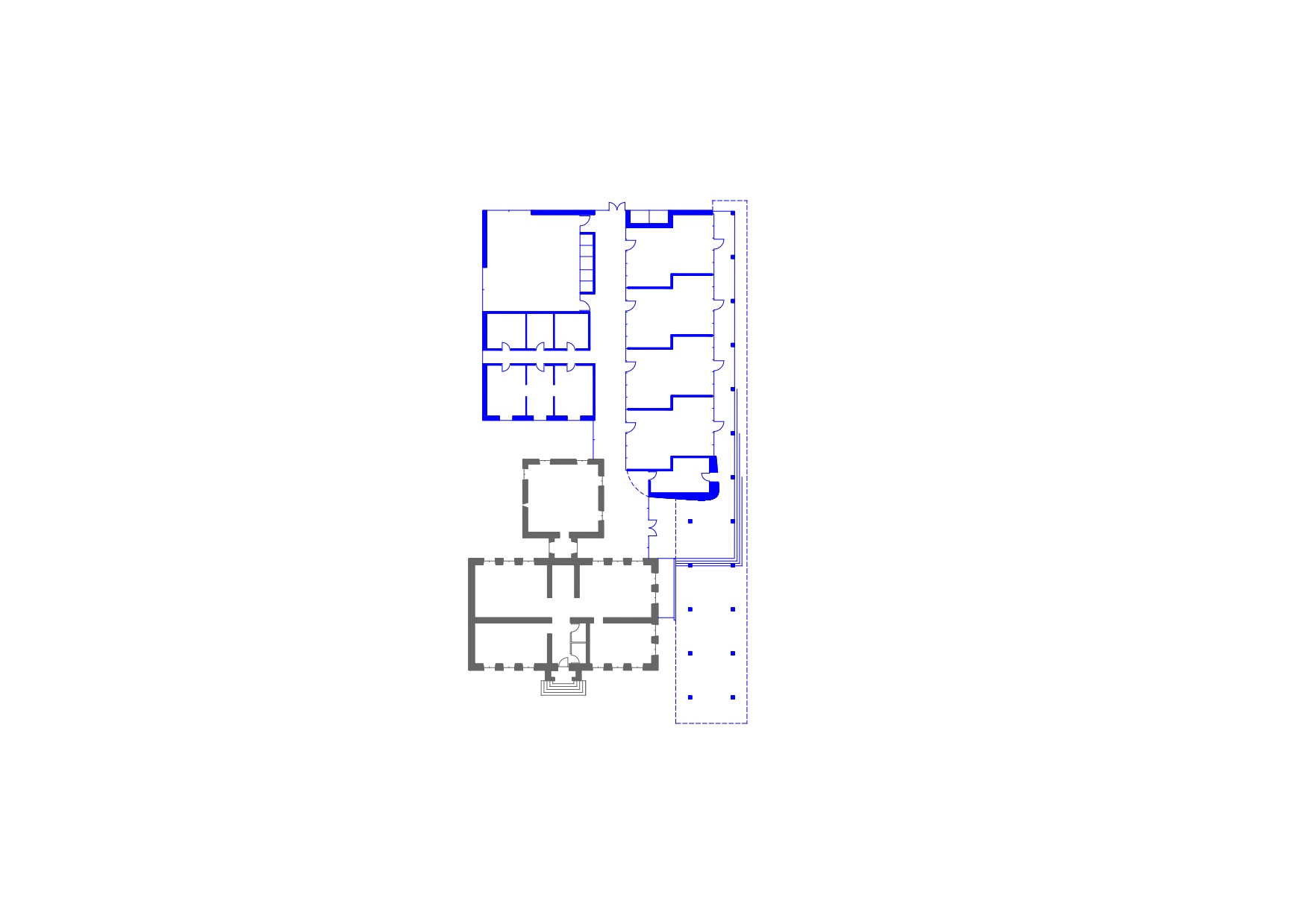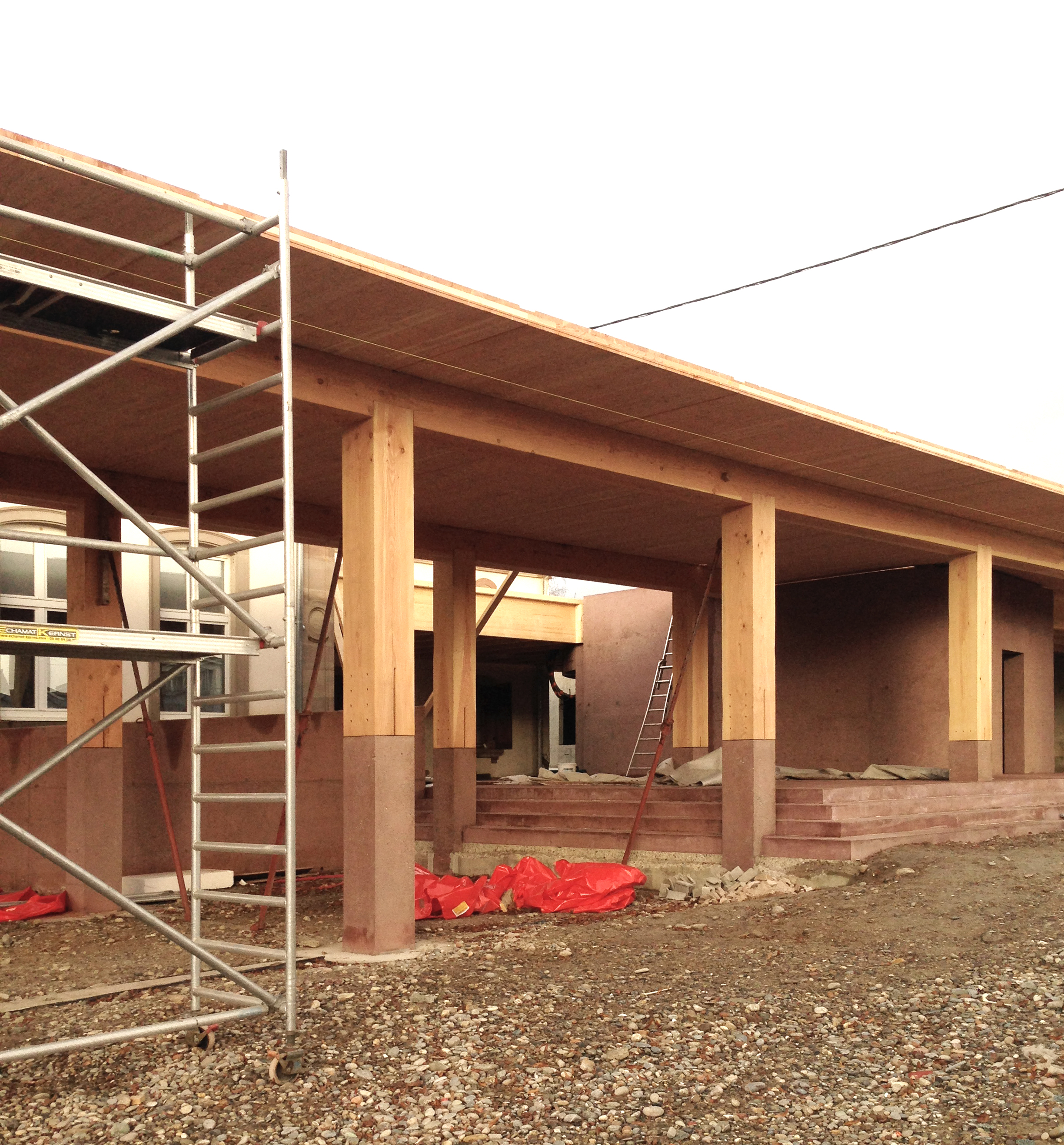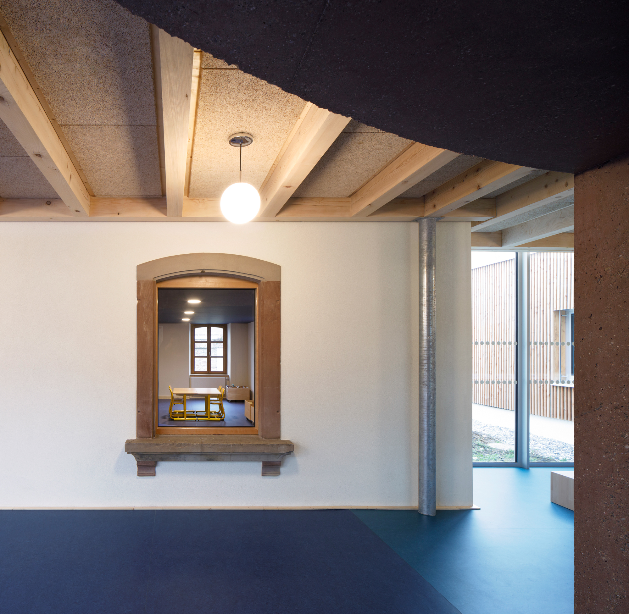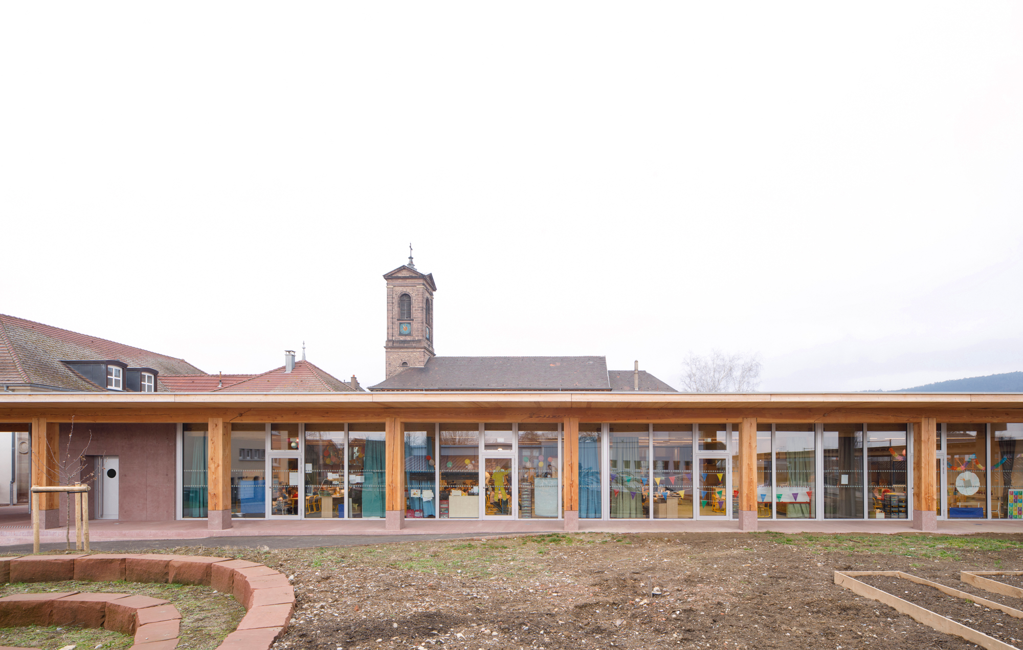 Le préau qui devient parvis devant le hall d’entrée et galerie devant les salles de classes, repose sur des blocs et sur un volume sculptural en béton sablé teinté rose en dialogue avec la pierre de taille du bâtiment existant. Le béton émerge du sol et l’emmarchement épouse la pente naturelle du site. Le hall, à l’articulation entre l’extension et l’existant dont les façades extérieures deviennent intérieures, se prolonge par le large couloir central. Il dessert les quatre salles de classes qui sont séparées entres-elles par un voile en forme de manivelle, rigidifiant le solivage de la toiture et compartimentant différents espaces à l’échelle des enfants.