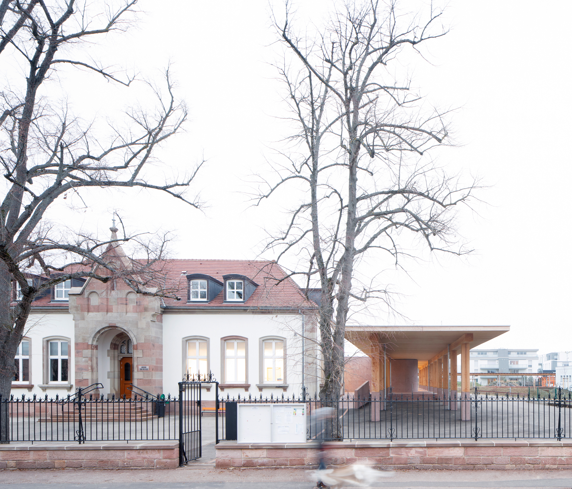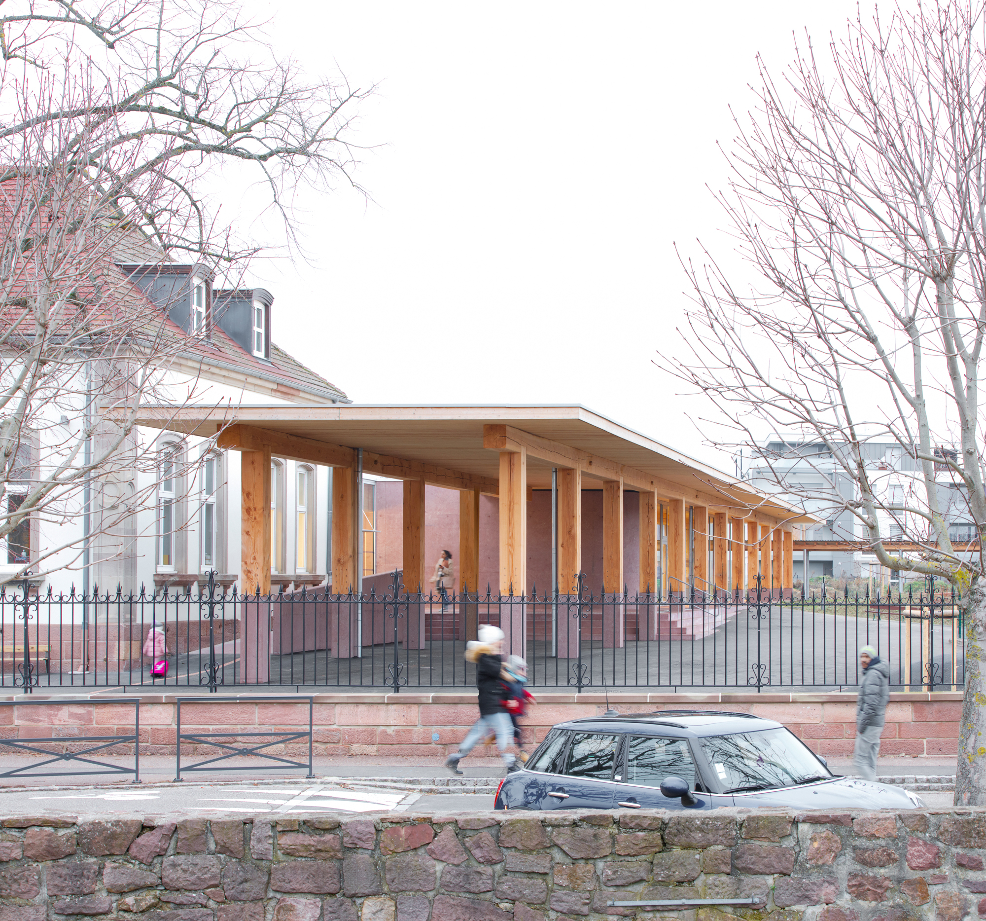 Le projet s’appuie sur le préau comme point de départ. Souvent délaissé, nous pensons que le préau est justement l’espace le plus important d’une école. Ici, il séquence le parcours des enfants, de la rue à la classe en passant par le hall d’entrée et le couloir. Il devient un repère tangible. Il acquiert une telle force qu’il dessine à lui seul la nouvelle façade de l’extension.