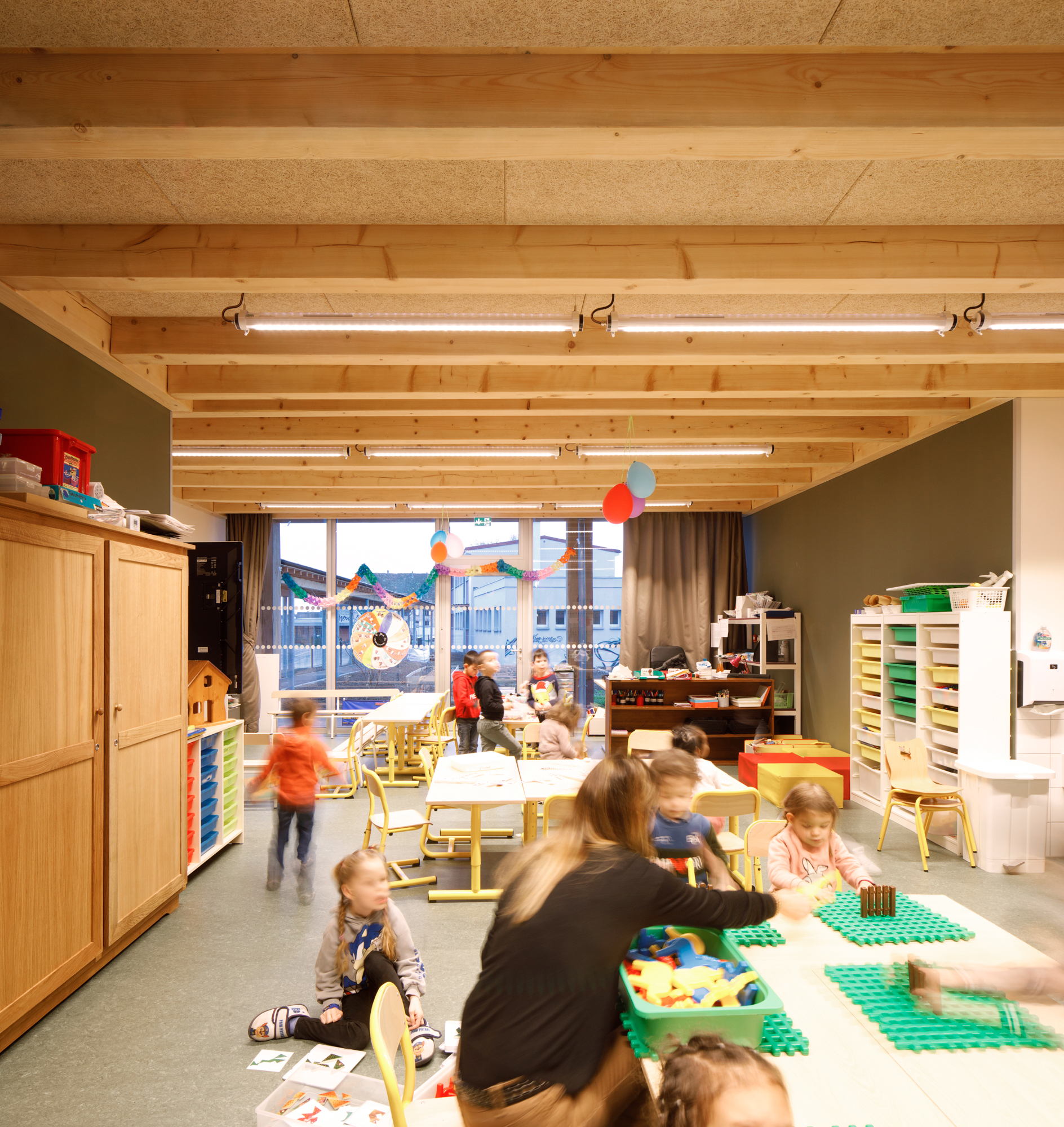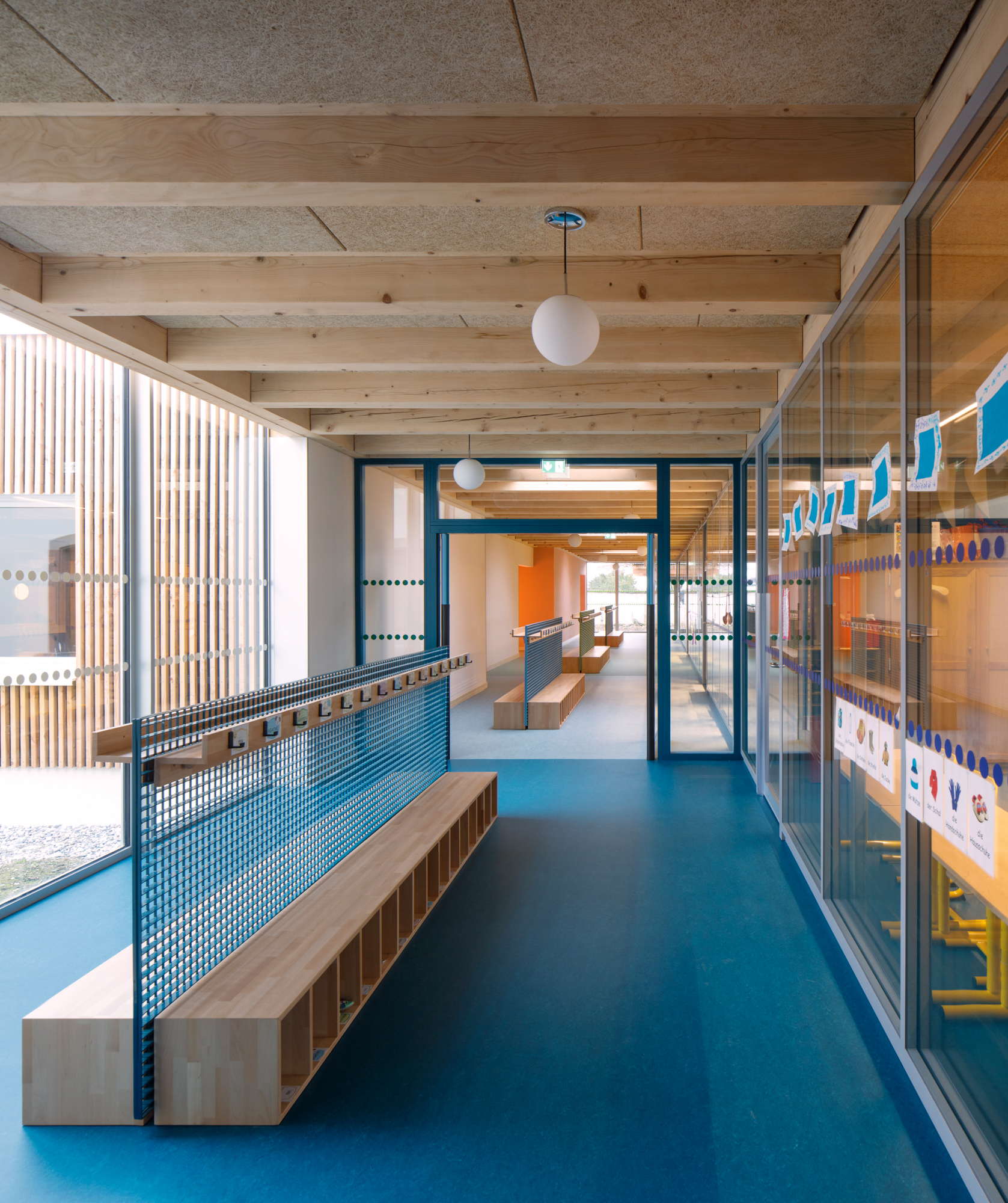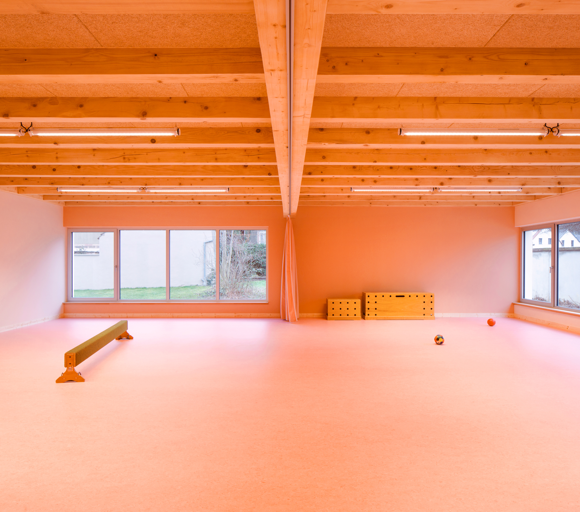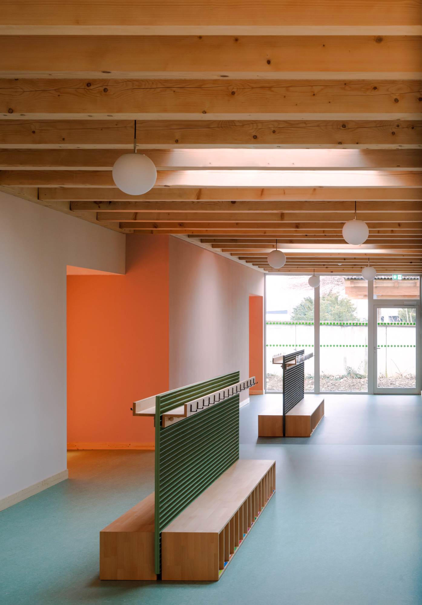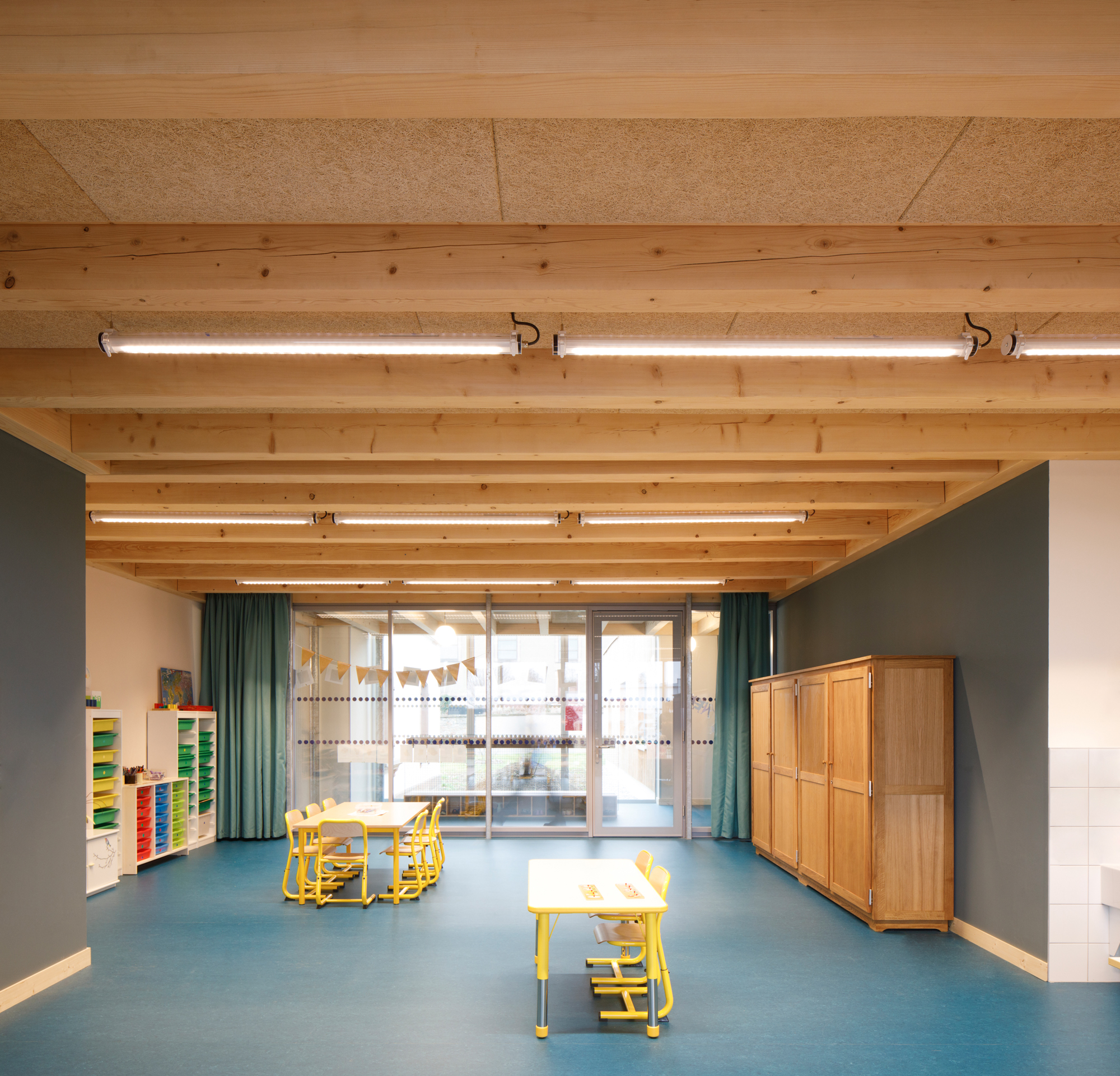 À l’opposé de la simplicité monumentale du préau, l’architecture intérieure regorge de particularités, de moments, de ressauts, de matières et de couleurs. Les différentes essences de bois se côtoient au gré des usages. La bonne essence au bon endroit. Les plafonds sont constitués par un solivage et muralières de poutres d’épicéa massif apparentes. Le mobilier est posé librement. Les bancs/vestiaires sont en hêtre quand l’armoire de classe est en chêne. Les parois vitrées s’accompagnent de rideaux. Notre architecture puise dans l’hétérogénéité des matériaux, la polychromie et la profusion de petites intentions un caractère domestique propre à l’appropriation.