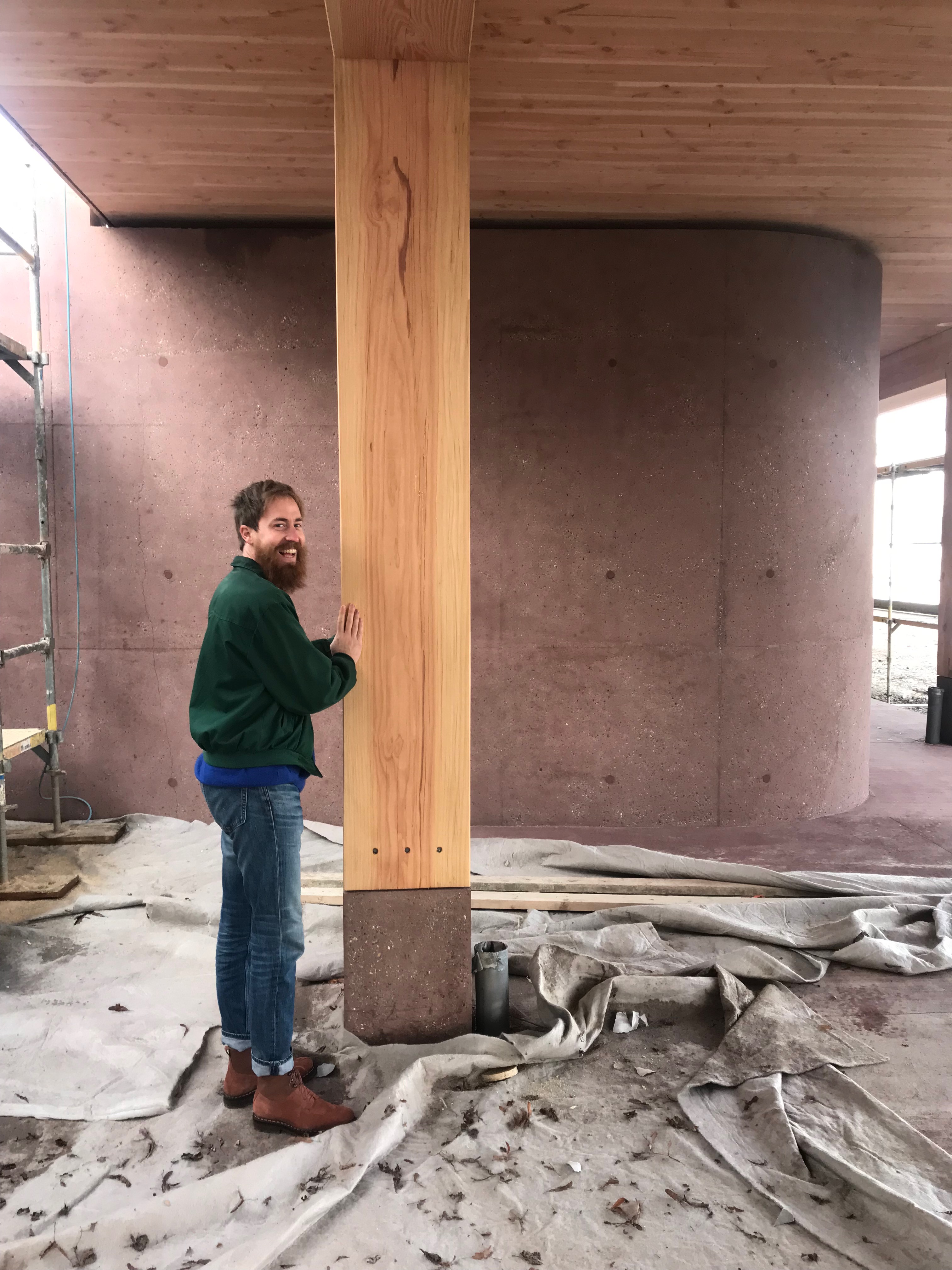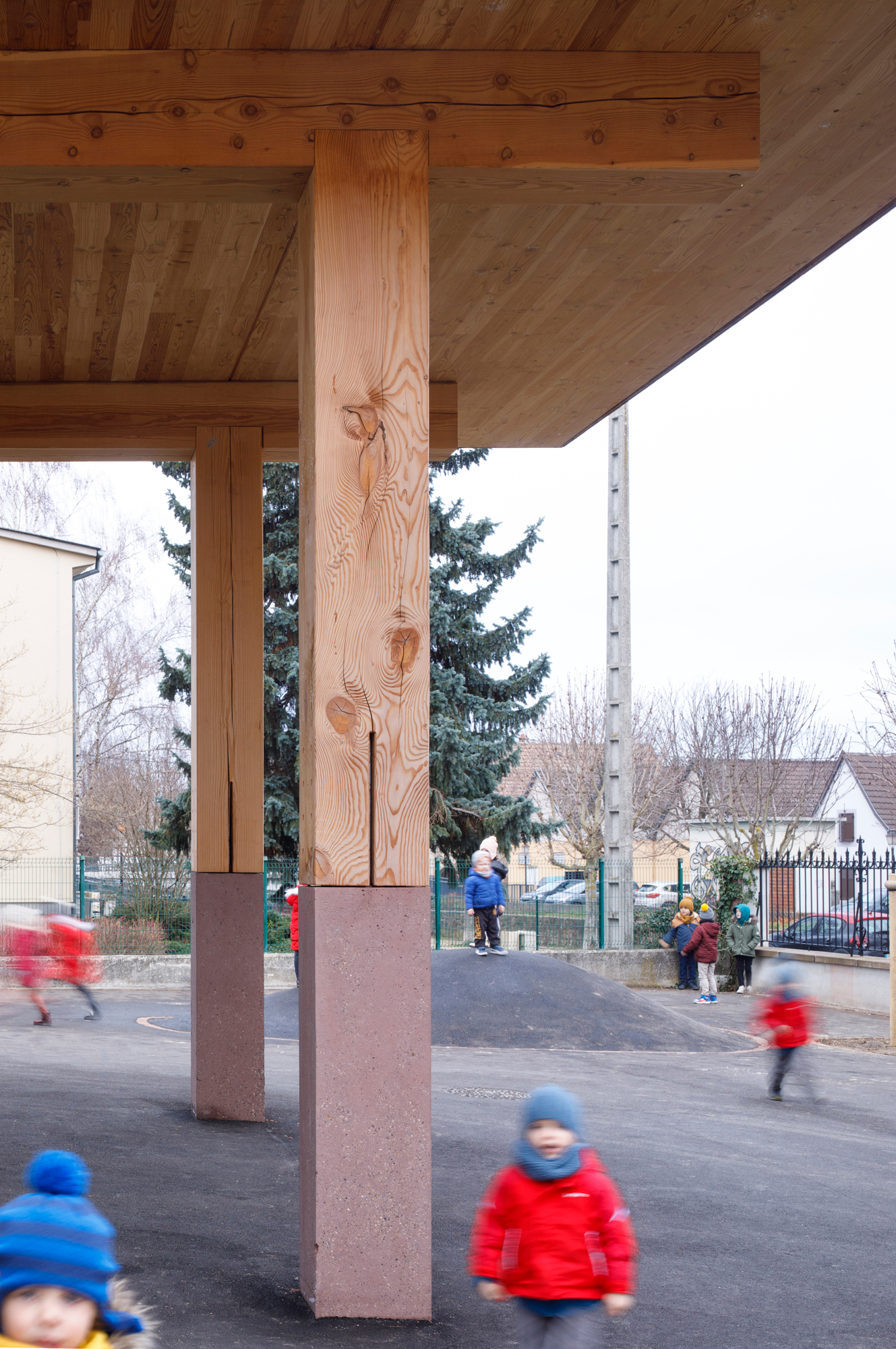 Composée d’une colonnade de piliers bois de section hors normes, il y a la volonté d’exprimer la nature brute des choses. Un arbre, un poteau. La section de 40x40cm exige des grumes d’environ 60cm de diamètre ce qui pour le douglas constitue le moment idéal d’abattage. Le bois provenant de forêts distantes de 50km est taillé vert, si bien qu’il sèche tranquillement mis en oeuvre. Les défauts, noeuds, fentes et gerçures sont voulues et recherchées, exprimant la singularité de chaque élément dans une approche poétique et didactique. Nous avons notre pilier préféré, comme nous imaginons que les enfants auront le leur.