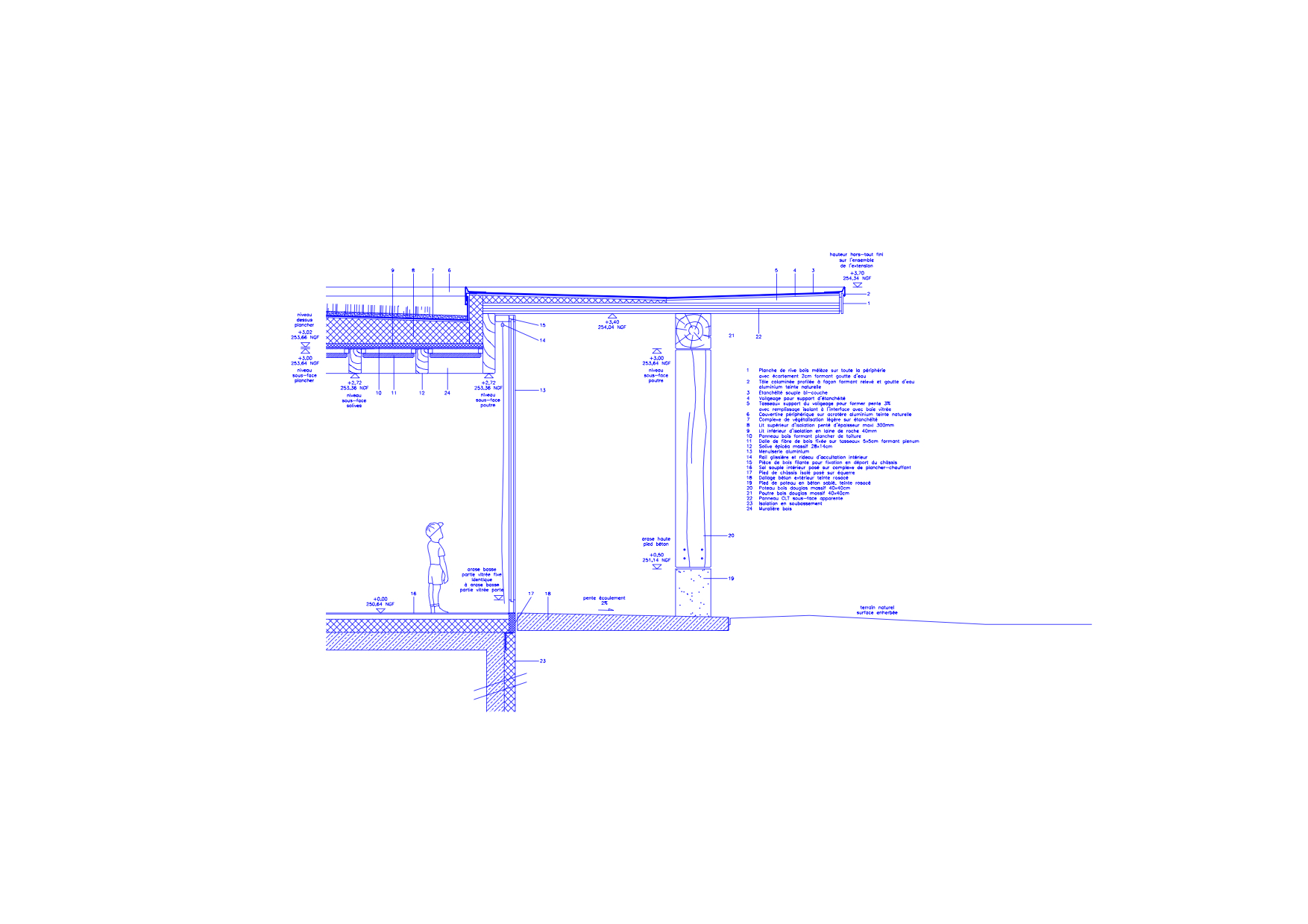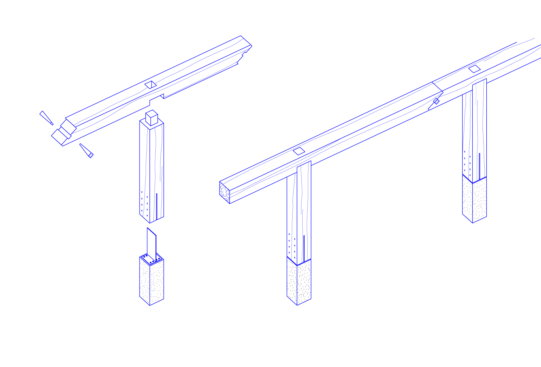Le sur-dimensionnement de cette colonnade exprime une humble-monumentalité qui permet de se raccorder à l’architecture classique du bâtiment existant. La section des bois permet également de sortir du langage de la standardisation. Tout est ici façonné, sélectionné et travaillé pour n’être posé qu’à un emplacement unique dans une dimension esthétique des techniques d’assemblages et dans une dimension sociale de la chaîne des savoirs des acteurs du bois. Chaque pillier repose sur son pied en béton. Il vient supporter les poutres en partie grugées et qui sont assemblées par des traits de Jupiter, serrées par des clés en chêne. Le savoir-faire du charpentier est fortement mis en valeur, formant à partir d’éléments non réguliers, une architecture rigoureuse et régulière. Seule exception qui confirme la règle, la colonnade est coiffée de dalles bois en CLT qui contreventent le tout et permettent d’épurer le dessin vers un Stonehenge de bois.