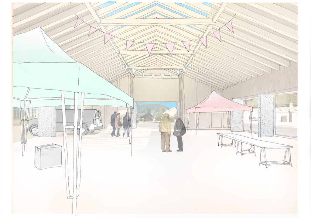 La déclivité du sol est conservée telle quelle pour lier le coeur du village à ses montagnes. Un couronnement périphérique de piliers en béton embrasse cette pente et assure l'assise horizontale de la charpente ainsi hors des intempéries. De larges ouvertures vitrées et des panneaux de bois à ouverture en accordéon permettent de fermer ou d'ouvrir la halle au gré des usages et des saisons.