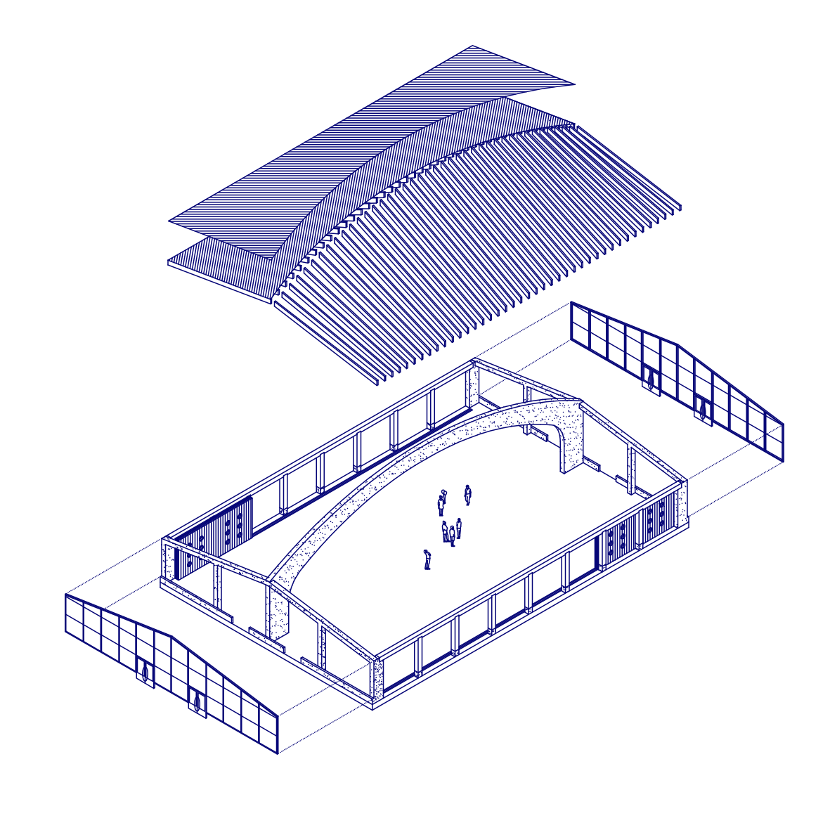 Une halle couverte ce n'est pas grand chose puisque c'est surtout un grand vide. Ce dernier est caractérisé par 3 éléments. L'arche en béton qui rabat les efforts de la toiture sur les pignons et permet de franchir les 33 mètres de portée. Les colonnades latérales en bois qui définissent les façades principales, poreuses et rythmées. Enfin, une nappe de chevrons assurant la liaison entre l'arche et les colonnades, passant de l'horizontalité à la courbe, façonnant une toiture en coque de navire renversée. Cette géométrie permet d'offrir un espace à la hauteur généreuse en son centre, tout en maintenant une hauteur relativement basse aux quatre angles de la construction respectant le prospect et le gabarit du bâti voisin en périphérie.