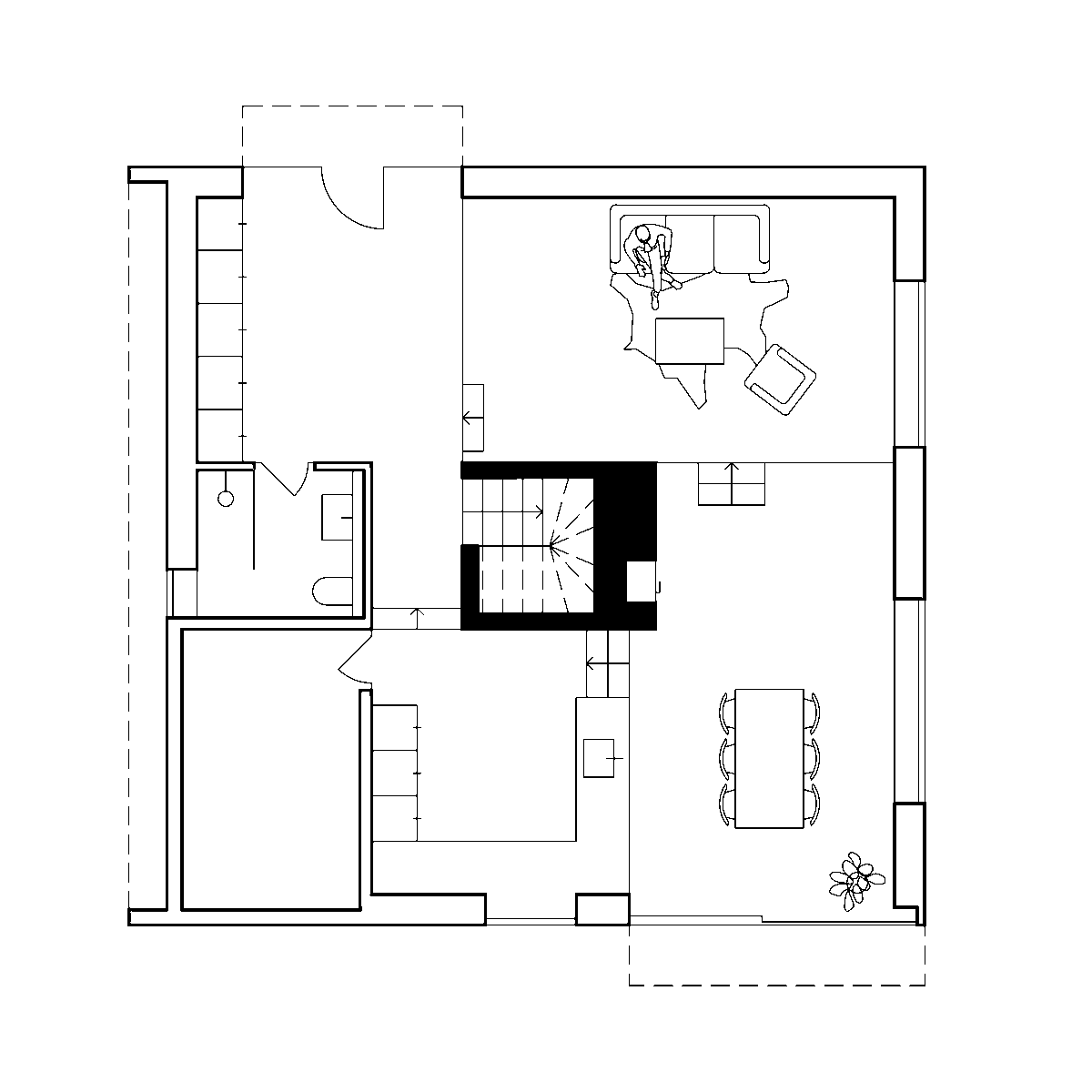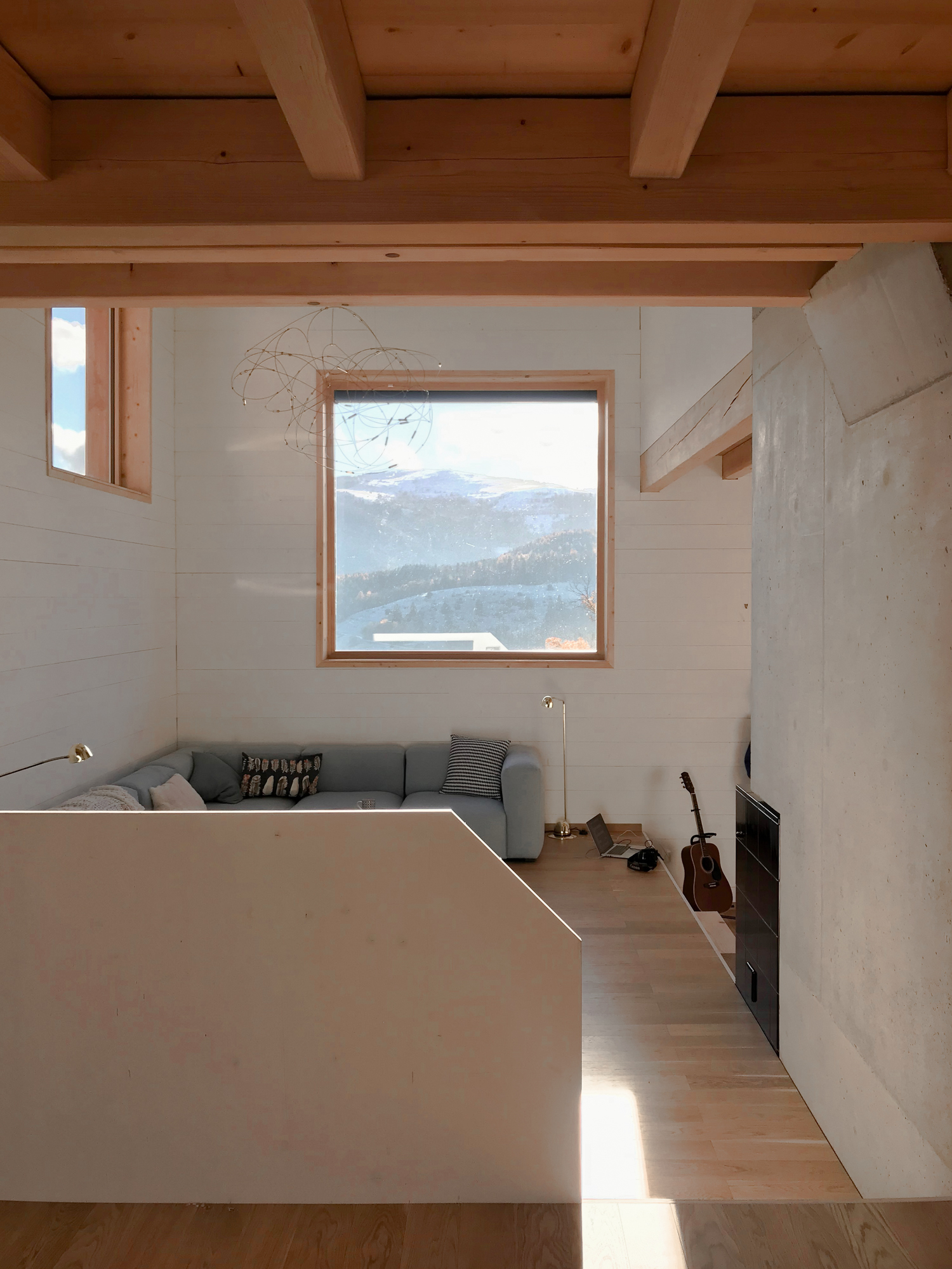 Le plancher bas s'échelonne sur 4 niveaux en fonction du terrain naturel. Ces niveaux définissent 4 espaces, l'entrée, le séjour, la salle-à-manger et la cuisine. Formant chacun un rectangle d'or, ils tournent autour d'une verticalité centrale maçonnée qui accueille l'escalier et le poêle de masse. Avec son corbeau qui supporte trois solives, son trou de boulin au-dessus du poêle et sa fenêtre haute biseautée, transparaît indubitablement la symbolique du donjon. Centralité géométrique, c'est le coeur du foyer au propre comme au figuré. Par sa masse et son plan carré, le donjon participe à l'inertie de la maison contrebalançant la légèreté des façades et contreventant l'ensemble de la charpente bois.