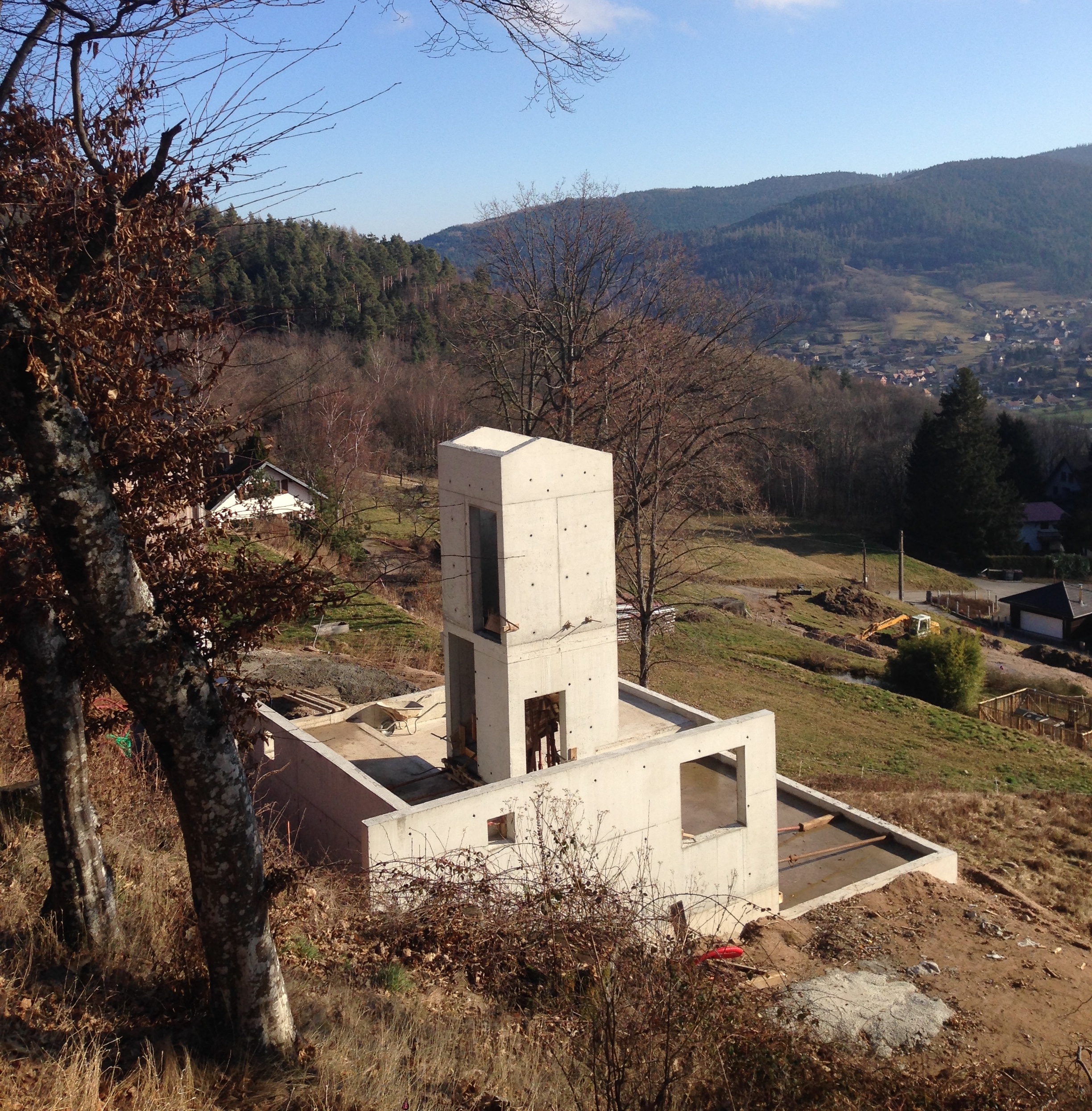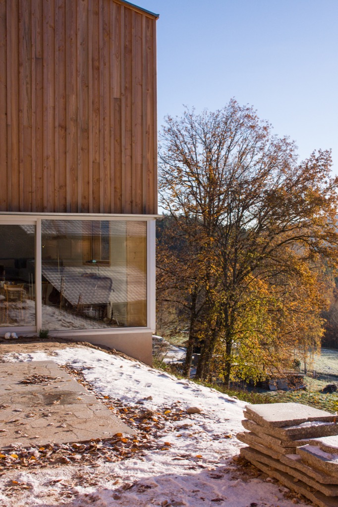 Face au massif du Petit Ballon et devinant à peine les monolithes granitiques dressés sur la chaume du Steinberg (1177m), la maison propose ses tableaux. Ses larges fenêtres sont à l'échelle du paysage, les autres soulignent la dimension domestique. Il y'a une imbrication du grand et du petit qui dialoguent au fil des quatre façades.